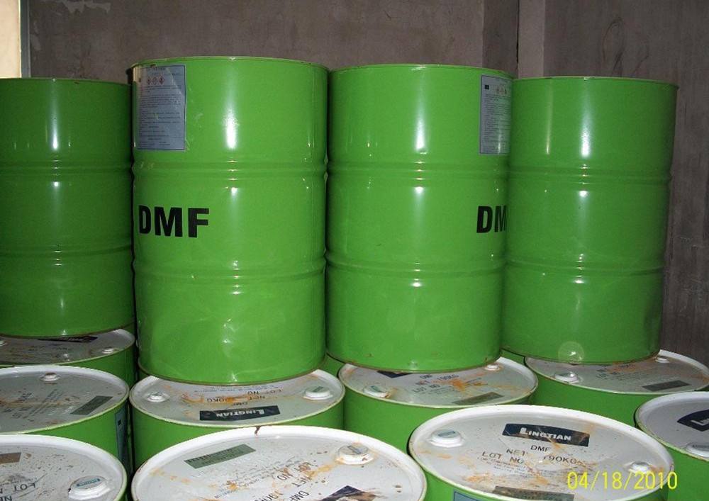 2、 纯DMF具有安定性、不易分解之特性。若仅与水形成混合液亦不易分解;但如有微量的酸或碱,在酸的作用下分解成二甲铵盐和甲酸,在碱的作用下,分解成二甲胺和甲酸盐。在紫外线的作用下分解成二甲胺和甲醛,加热到350摄氏度左右分解成二甲胺和一氧化碳。